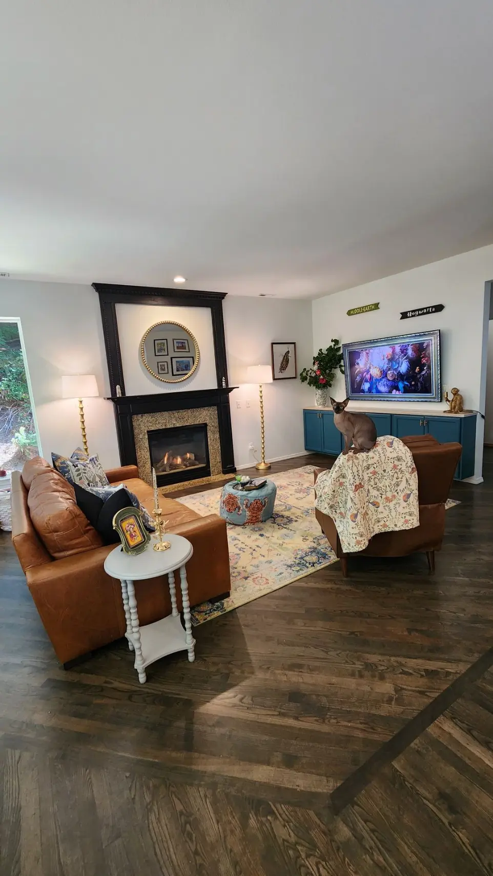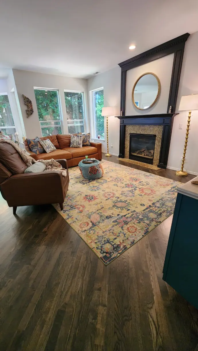 Once the structure was right, I got to do my favorite part: layering in the personality. The rug is from Wayfair, the sofa is Restoration Hardware, and the granite around the fireplace is original. The accessories? Pure treasure hunting — a tiger poof, a peacock painting, a side table, even the oversized vase, all from HomeGoods. Every piece feels collected and loved because it IS.
